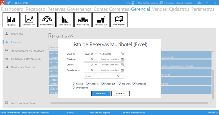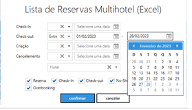 O relatório necessário é a última opção da lista, o “Lista de reservas Multihotel (Excel)”. Para abrir a planilha de configuração do relatório basta clicar duas vezes em cima da opção.