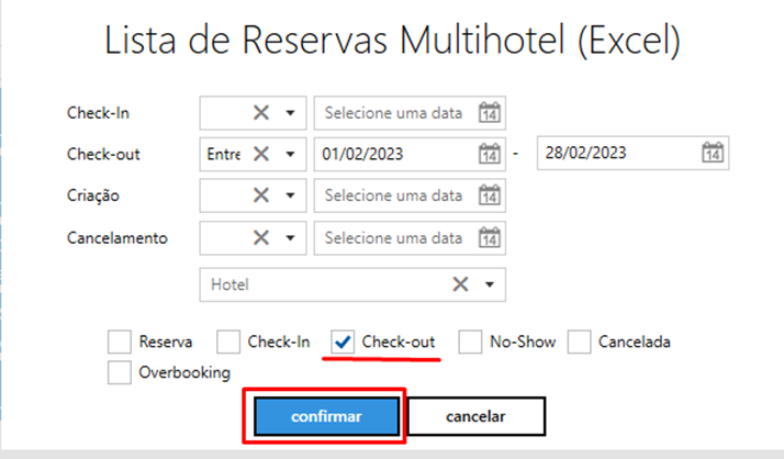 Escolhendo a data, desmarque as demais opções do rodapé deixando apenas “Check-out”. Após, clique em confirmar.