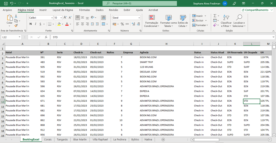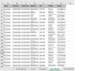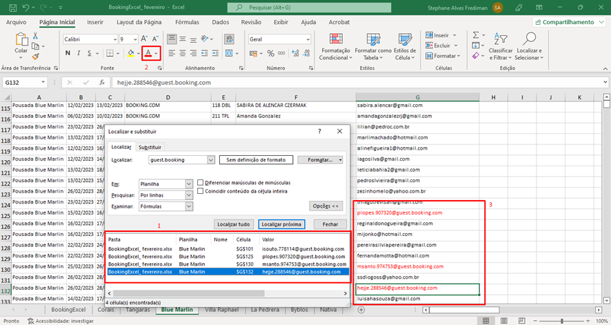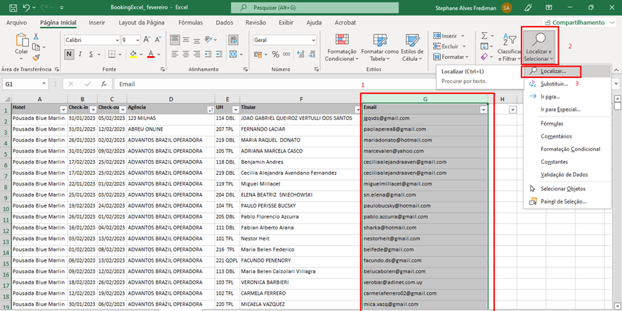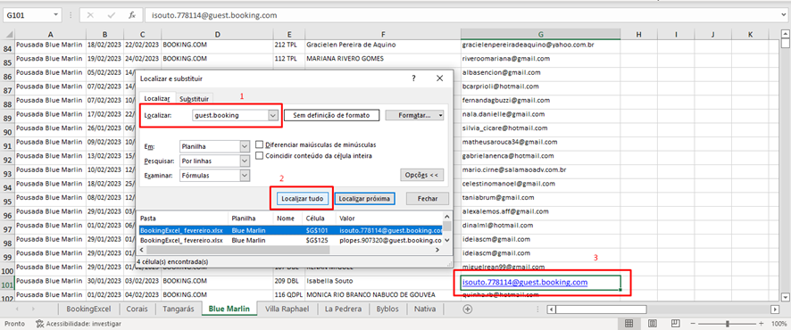 Parte precisa ser visto a olho, mas podemos facilitar a procura usando a ferramenta de pesquisa do Excel e procurando termos como “guest.booking.com” do Booking ou “expediapartnercentral.com” do Expedia.