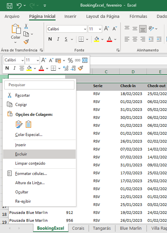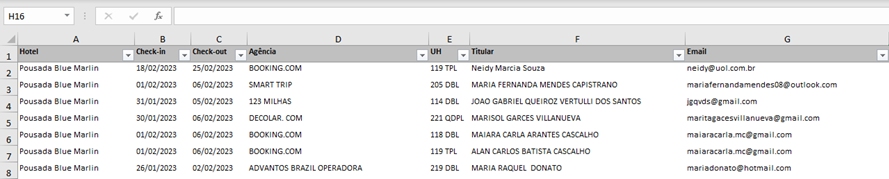 Para facilitar a visualização, serão mantidos apenas os itens relevantes e os demais serão excluídos. Manteremos: Hotel, Check-in, Check-out, Agência, UH, Titular e E-mail.