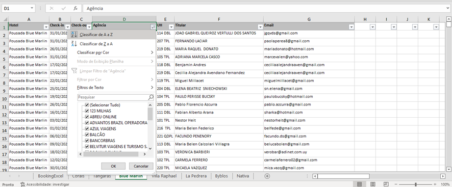 Clique na seta de filtro da coluna “Hotel”, selecione uma das pousadas e clique em “ok”.